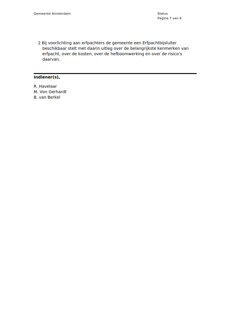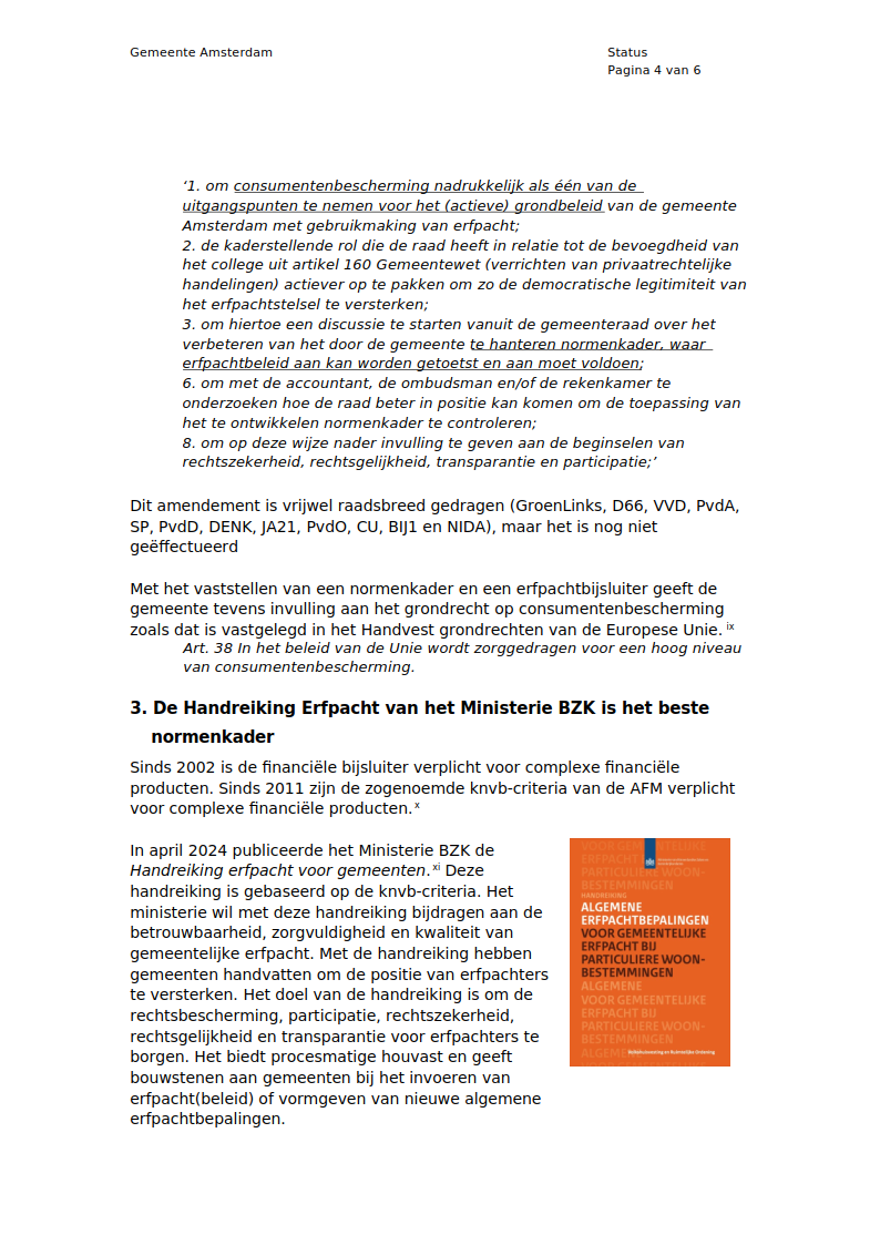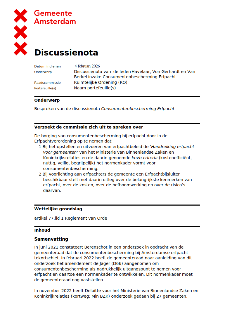 Woensdag 4 februari 2026 werd in de Raadscommissie RO van de City of Amsterdam de Discussienota Consumentenbescherming Erfpacht besproken van CDA Amsterdam Rogier Havelaar Laurens Lochtenberg, Amsterdamse VVD Myron von Gerhardt en JA21 - Het Juiste Antwoord Cas van Berkel.